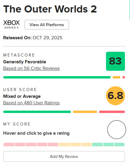《天外世界2》今年10月30日发售,简体中文评价褒贬不一,597篇评价中只有63%的用户给出好评。在Metacritic上,该作的用户评分差不多,为6.8分。