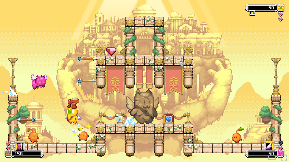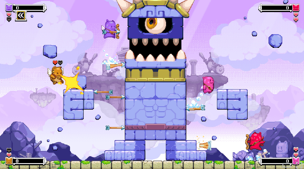 这是一款街机风平台跳跃射击游戏,你将化身天使猫猫,拿起弓箭守护家园。
