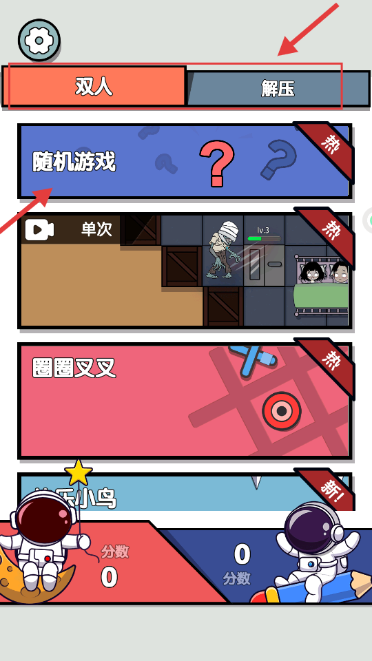 1、在游戏选择页,选【双人】或【解压】标签下模式(如随机游戏),进入玩法。