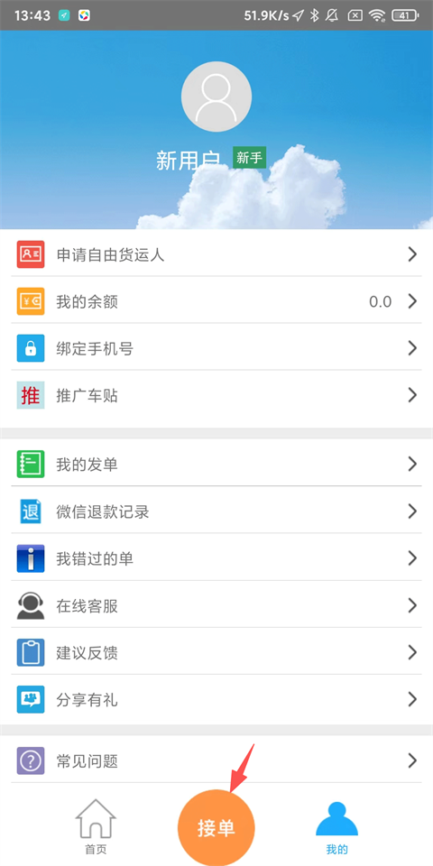 1、下载注册并登录货运帮APP,点击下方接单按钮;