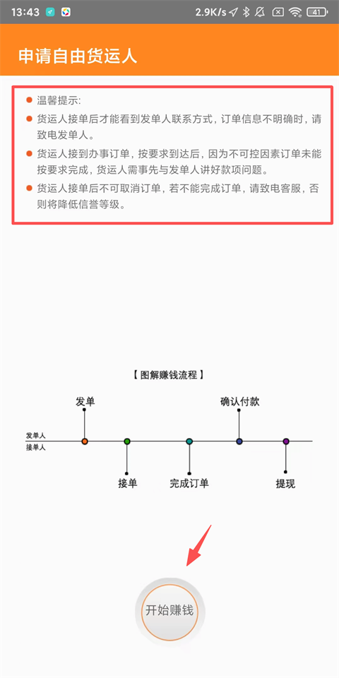3、仔细阅读申请自由货运人温馨提示,随后点击开始赚钱;